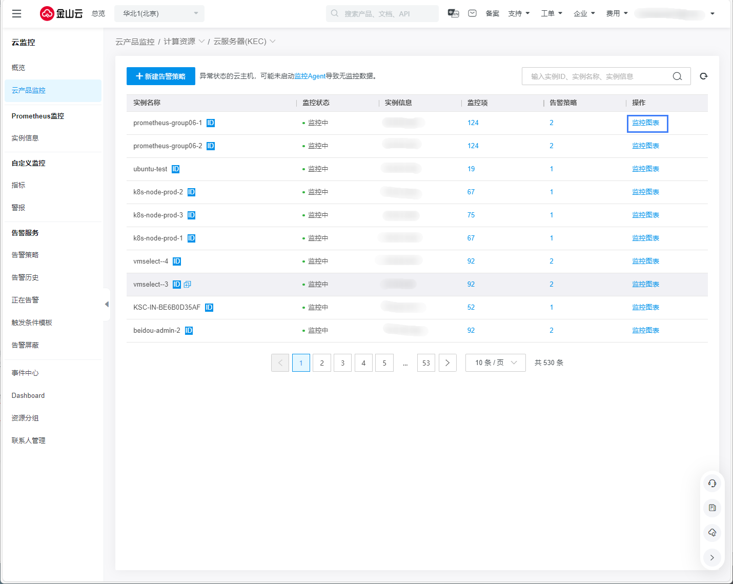 云监控控制台【云产品监控】选项下,选择对应云服务类别。在实例列表中可以查看单个实例的监控图表。