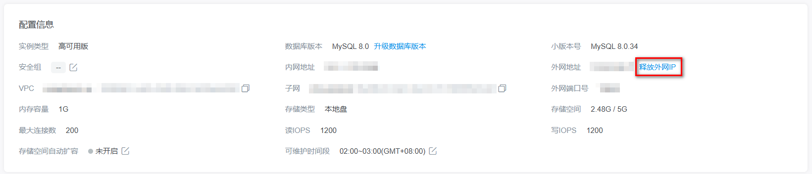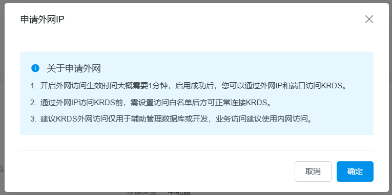 4. 如使用同机房主机,不支持通过外网IP访问KRDS。开启成功后,即可在配置信息中查看到外网地址。