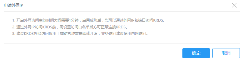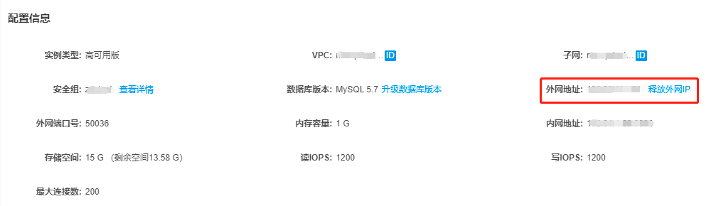 4. 如使用同机房主机,不支持通过外网IP访问KRDS。开启成功后,即可在配置信息中查看到外网地址。