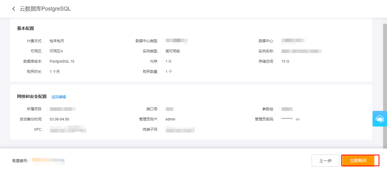 3.点击实例按钮,单击新建实例按钮,进入云数据库PostgreSQL购买界面。