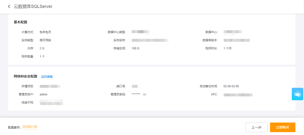 3.点击实例按钮,单击新建实例按钮,进入云数据库SQL Server购买界面。