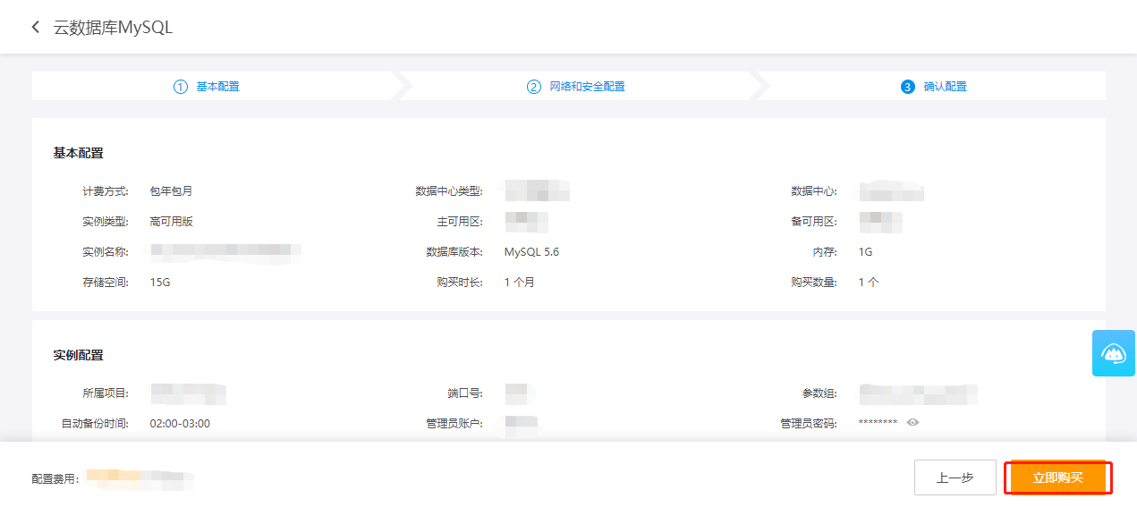 选择内存大小、存储空间,确定计费方式。