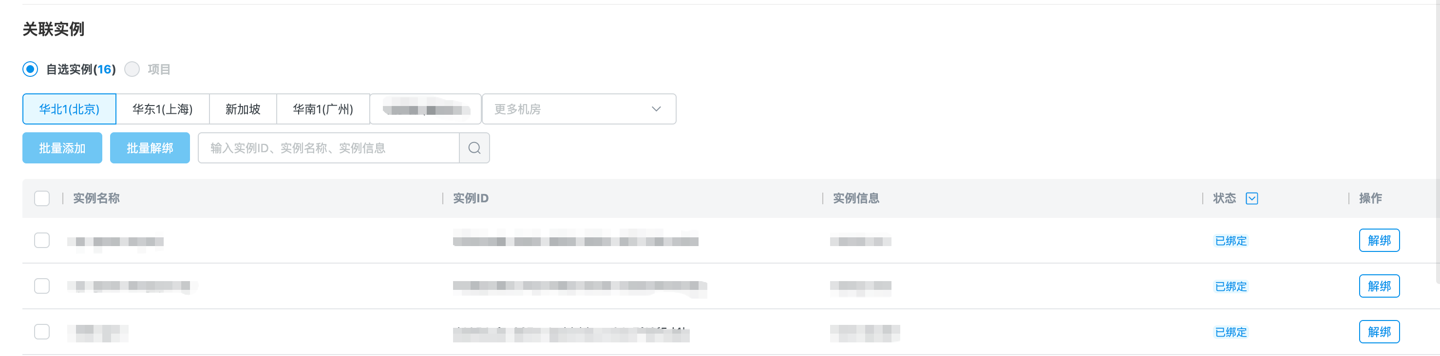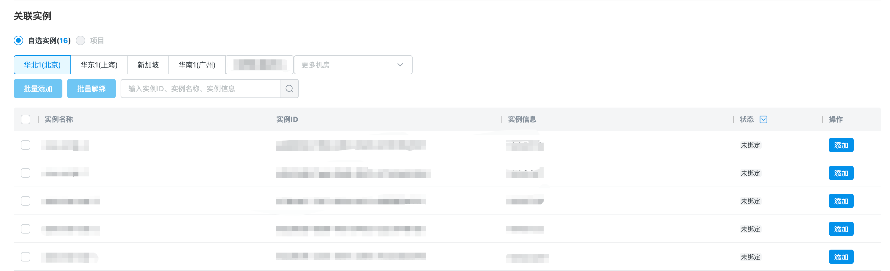 3、分机房查看实例列表,支持输入查找。筛选状态为“未绑定”后,可勾选实例作为新增的告警对象。