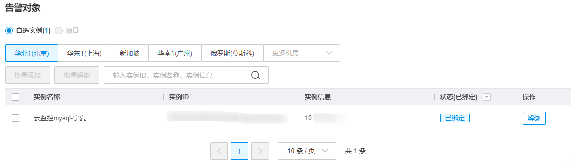 筛选状态为“已绑定”后,可解绑实例,不再作为告警对象。