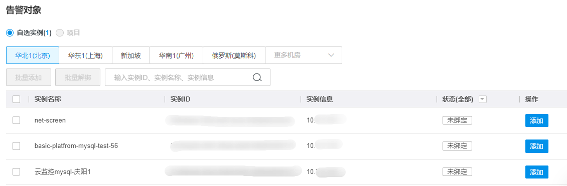 3、分机房查看实例列表,支持输入查找。筛选状态为“未绑定”后,可勾选实例作为新增的告警对象。