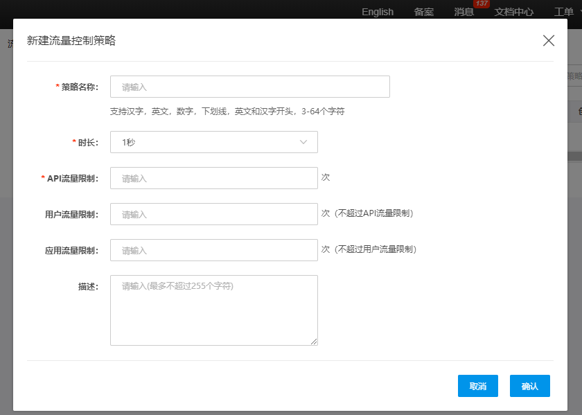 API流量限制:该策略绑定的API在对应环境的单位时间内被调用的次数不能超过设定值,单位时间可选秒、分钟、小时、天,如5000次/分钟。
