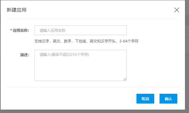 2.单击“新建应用”,弹出“创建应用”对话框。填写应用名称和描述信息。