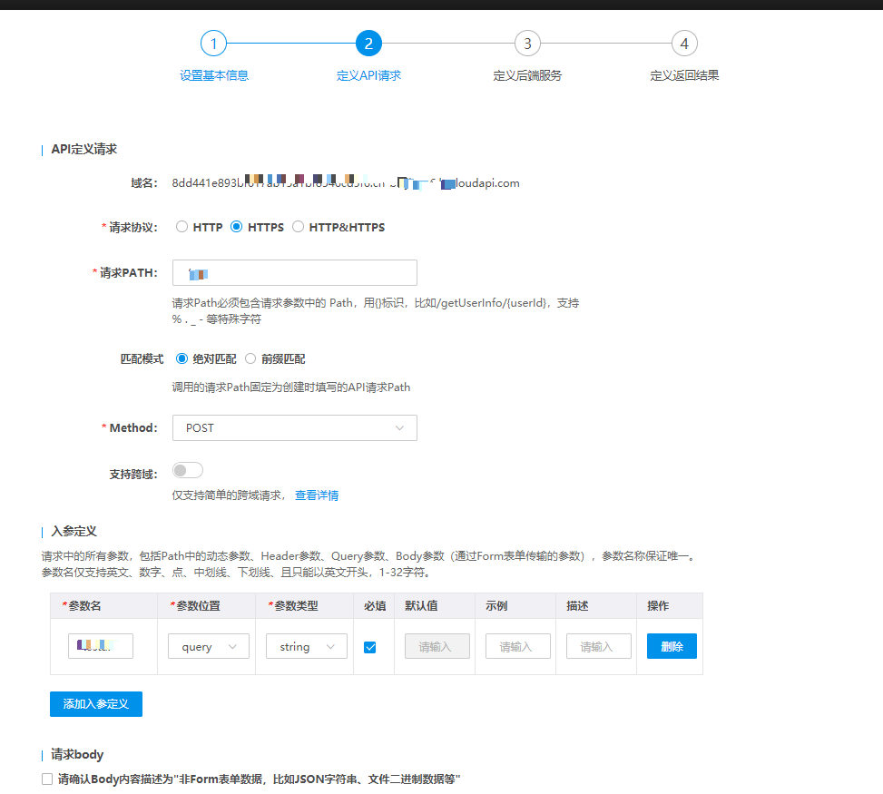 3.第二步【定义API请求】中按照页面提示,设置客户调用API时的前端入参信息。