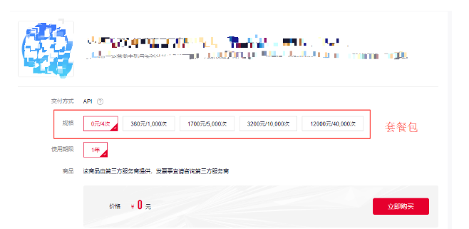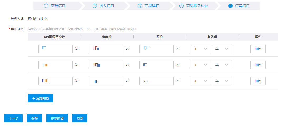 您可以维护多个规格,每个规格可定义客户购买的套餐调用次数以及价格和使用有效期。