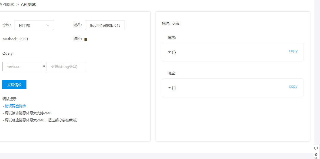 目前只支持form表单参数和json格式的body参数进行调试。调试的内容为当前最新保存的API的信息。