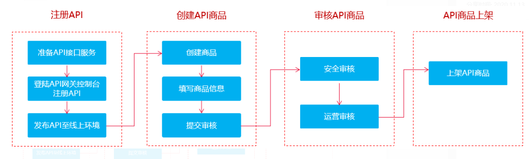 发布云市场API商品之前,服务商需要将API在【API网关】进行注册并调试通过。API注册成功后,可以将API发布至云市场进行售卖。接入流程如下: