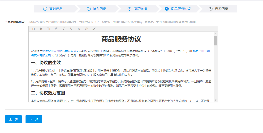 | 服务协议 | 必填,此页面是按照默认模板生成的一份协议,您可以在云市场提供的模板基础上进行修改,也可以使用您自己的模板。此协议内容是购买用户和服务商直接的法律约束协议,建议由贵司法务提供或审核后再上传。因商品产生的法律风险将由服务商提供。 |