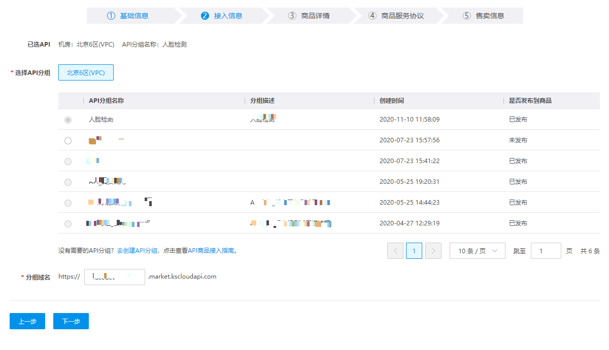 | 选择API分组 | 必填,页面会展示您在API网关发布的API分组服务,请选择您要上架云市场售卖的API分组。 |