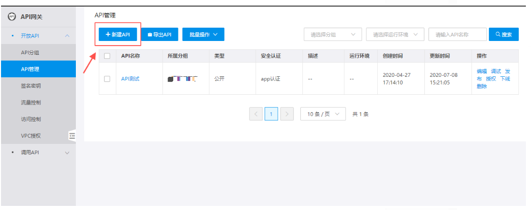1.访问【API网关】-【开发API】-【API管理】,点击【新建API】按钮