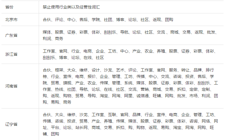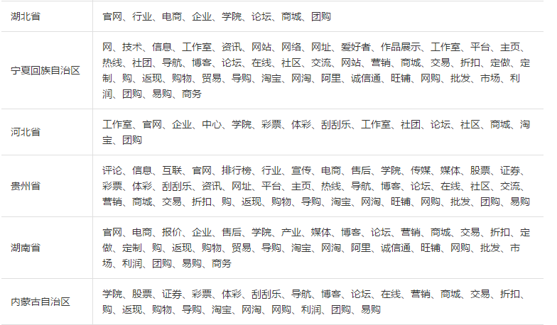 •部分省份个人备案网站名称不能使用行业、经营性关键字。参考列表如下: