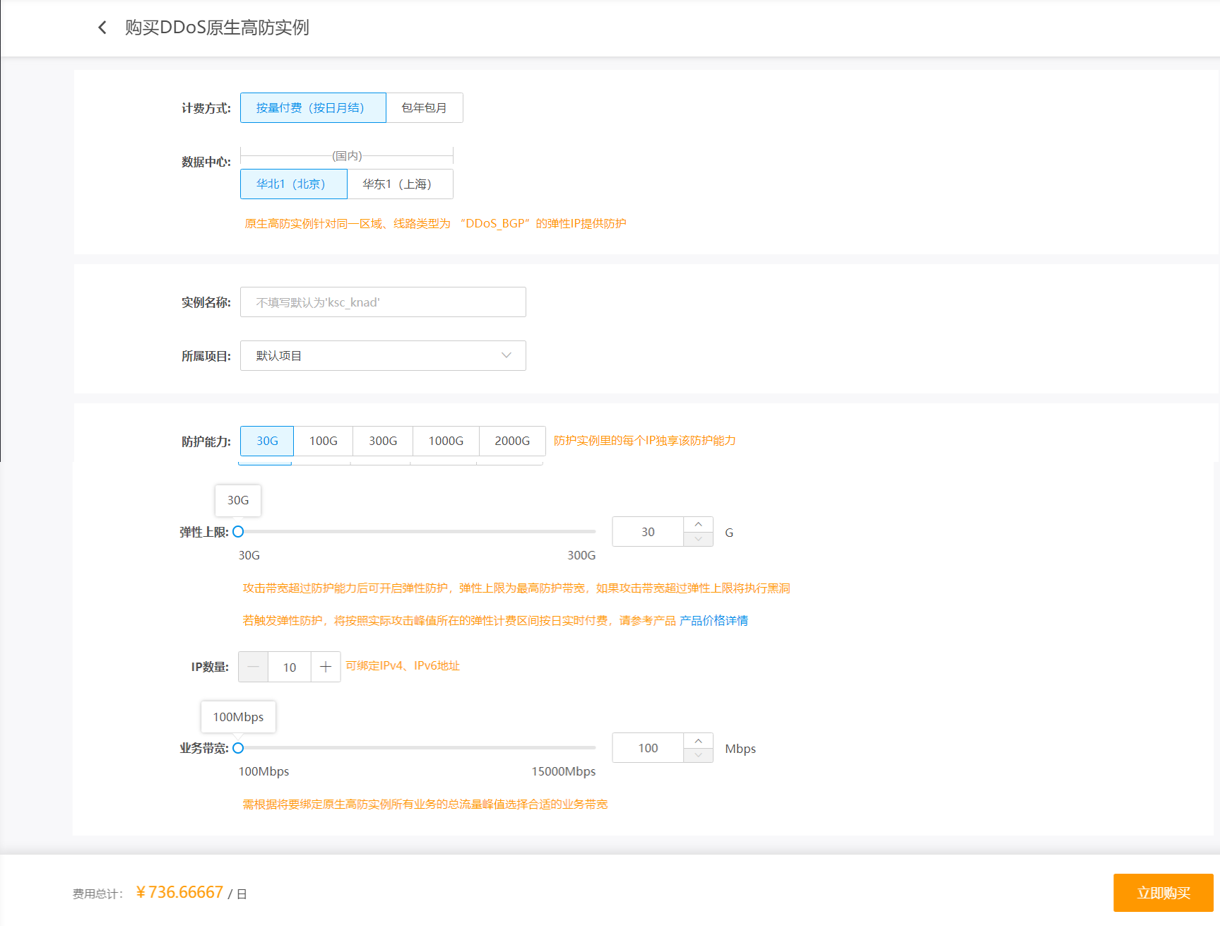 数据中心:原生高防实例针对同一区域、线路类型为 “DDoS_BGP”的弹性IP提供防护。。 防护能力:防护能力为保底防护带宽,最小30G起。 弹性上限:弹性上限为最大的防护带宽,建议您调整到最大弹性上限。 IP数量:当前防护实例可绑定的IP数量,默认10个,单个实例最多100个。 业务带宽:当前防护实例下所有业务的总带宽。
