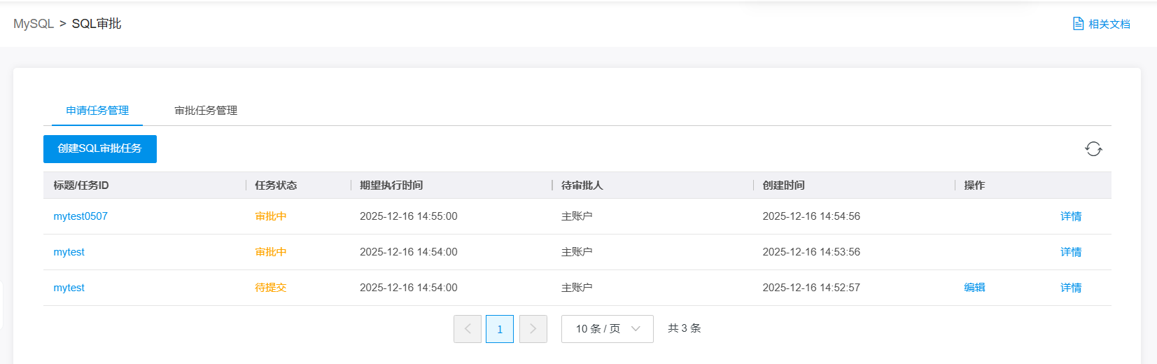 在MySQLSQL审批页,选择申请任务管理,点击创建SQL审批任务。
