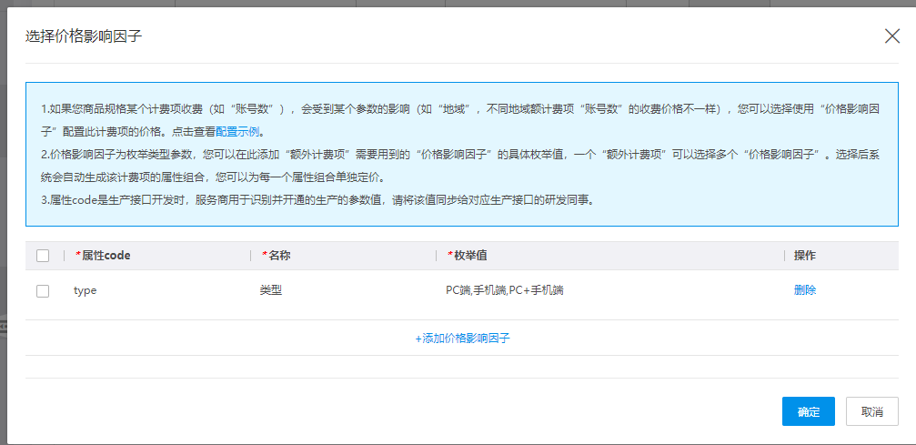 “额外计费项”和“价格影响因子”的属性code是生产接口开发时,服务商用于识别开通对应生产的参数值,请将该值同步给对应生产接口研发同事。