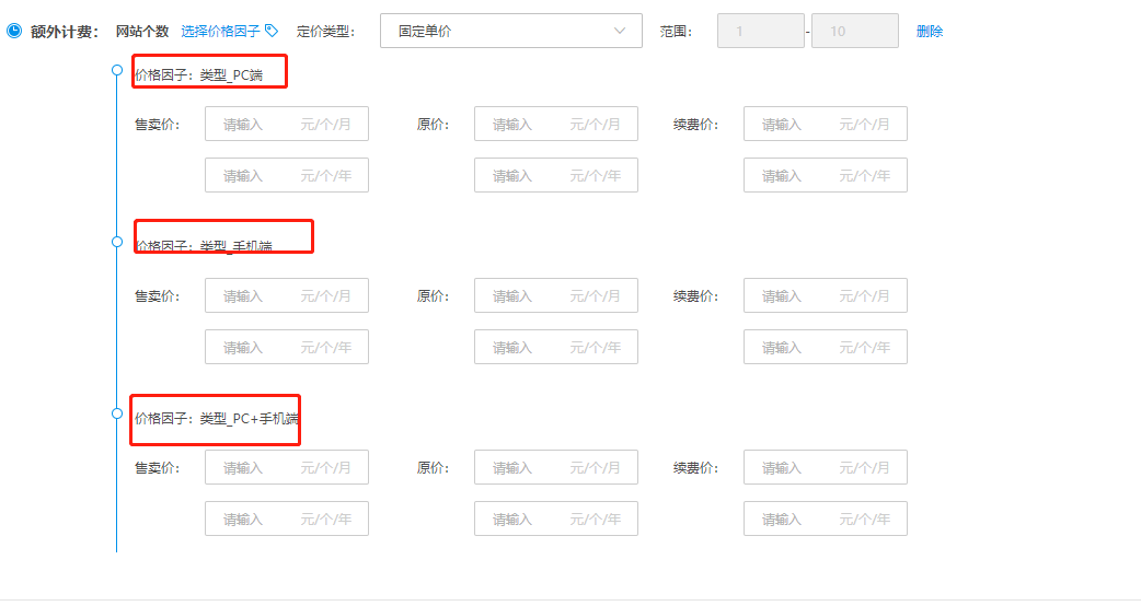 4)(可选)可以为每个额外计费项设置价格影响因子,如网站个数定价受类型影响(如收费项网站个数针对手机端和PC端的定价是不一样的)。此时可以再选择价格影响因子弹窗里设置此价格影响因子并选择。