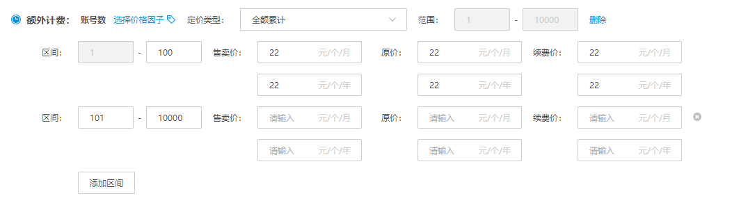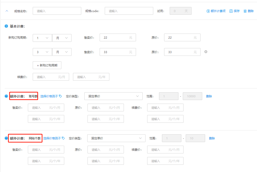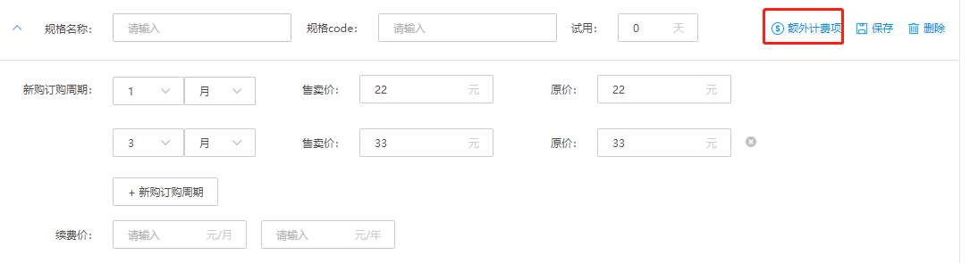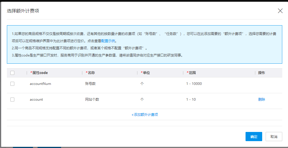 如果您的商品规格不仅仅按周期 or 按次收费,还有其他的按量计费的收费项(如”账号数““任务数”),您可以使用“添加额外计费项”配置此计费项并为此额外计费项进行定价。