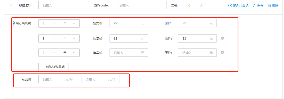 - 每个订购周期支持设置售卖价格和原价