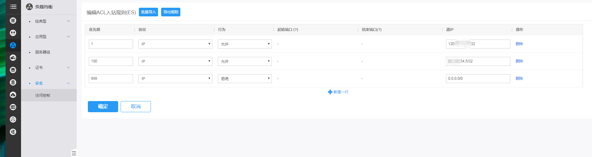 创建ACL,设置对应规则(999优先级设置全网拒绝,优先级1-998放开您可信的源ip地址)。