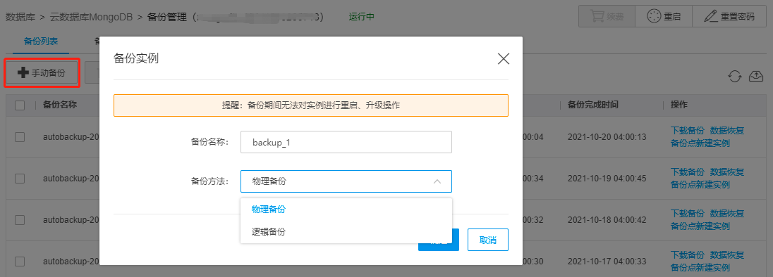 物理备份:备份实例中数据库相关的实际物理文件,备份速度快,备份成功率高,恢复简单;副本集实例和分片实例均默认为物理备份。同时支持副本集和分片集群。