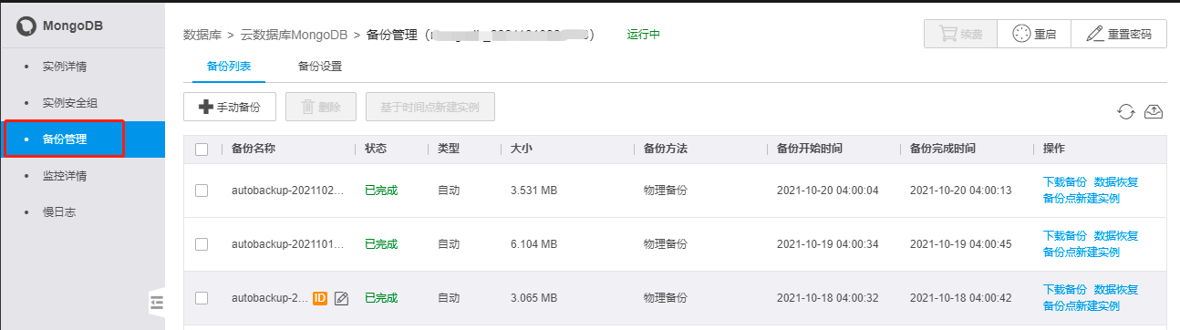 数据备份功能为MongoDB提供灾难恢复的能力,您可以通过设置备份策略,调整云数据库MongoDB数据备份周期实现自动备份数据,也可以手动备份MongoDB数据。