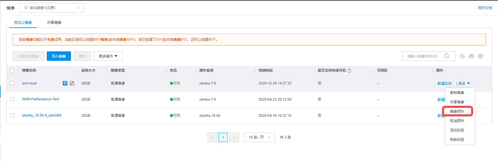 镜像预热:单击目标镜像对应更多列中的镜像预热。