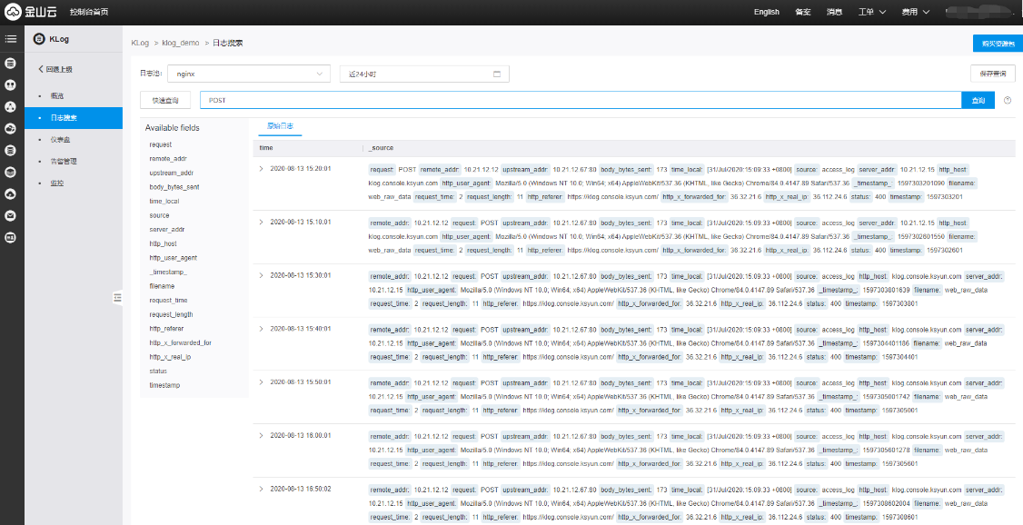 如下图,日志池选中”nginx“,时间范围选中”近24小时“,输入框中输入”POST“(区分大小写),点击查询,查询结果如下图。