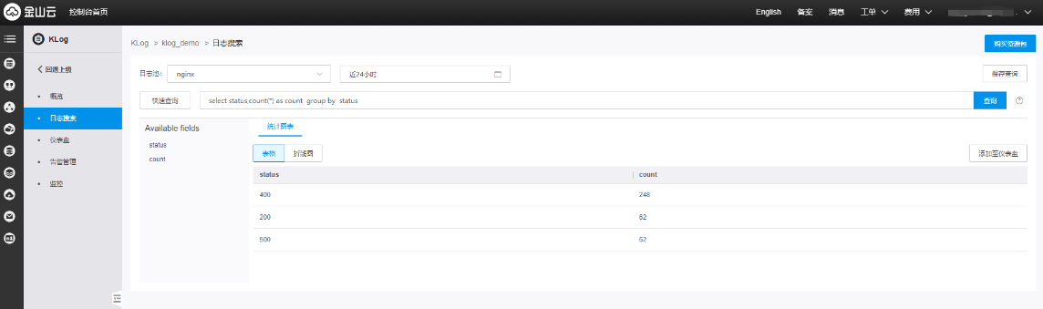 如下图,日志池选中”nginx“,时间范围选中”近24小时“,输入框中输入”select status,count(*) as count group by status“,点击查询,查询结果如下图。