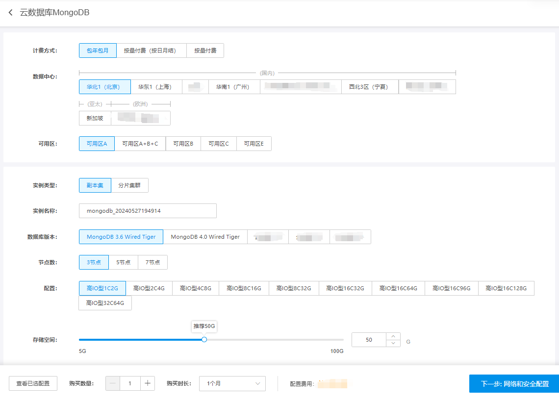 节点数 | 副本集实例默认3节点,可选5节点或7节点。选择更多的节点数,能够提高副本集实例整体的读性能。请根据业务需要进行选择。 |