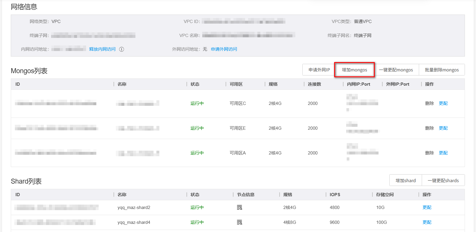 支持增加、删除mongos个数,增加的时候支持自由选择mongos规格。删除mongos不支持包年包月,支持按日月结,小时以及试用,mongos数量至少为2个。