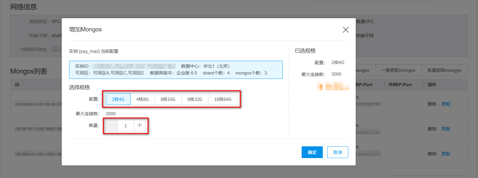 在弹窗中选择节点规格、及节点数量后,点击确定,完成增加mongos节点。