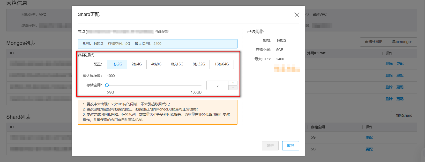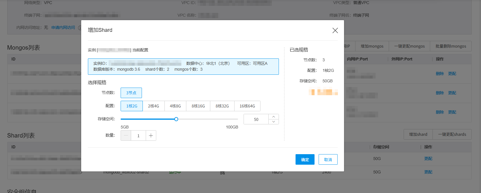 在弹窗中选择节点配置、存储空间及分片数量,点击确定,完成增加shard节点。