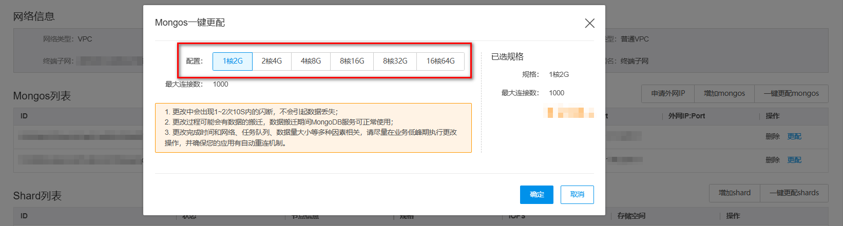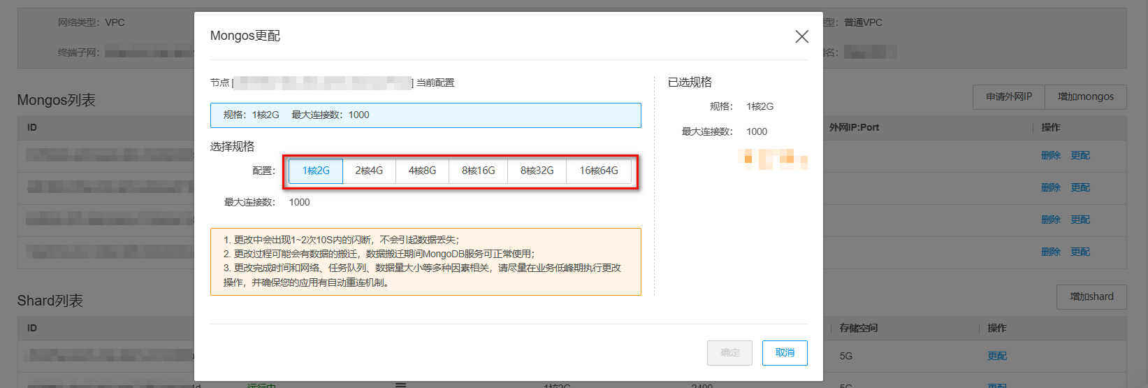 在实例详情页面,点击Mongos列表中的更配,弹出mongos节点更配窗口。