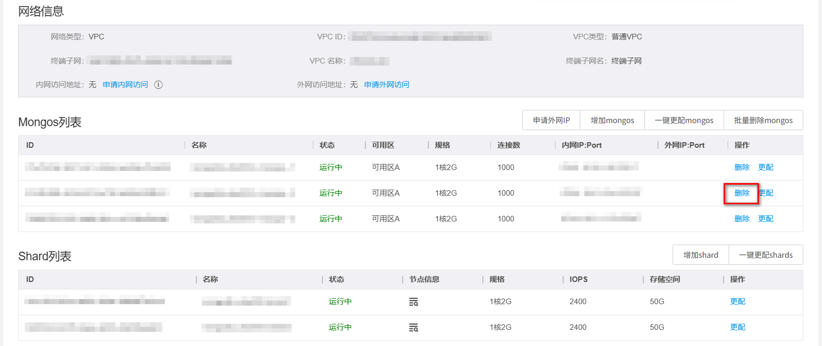 在实例详情页面,点击Mongos列表中的删除,弹出删除mongos操作确认窗口。
