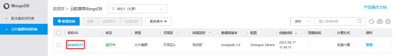 6.批量更改shards配置时,所选存储空间不能小于当前任一shard节点的存储空间。在云数据库MongoDB控制台左侧导航栏点击分片集实例列表,点击您需要更改配置的实例名称进入实例详情页。