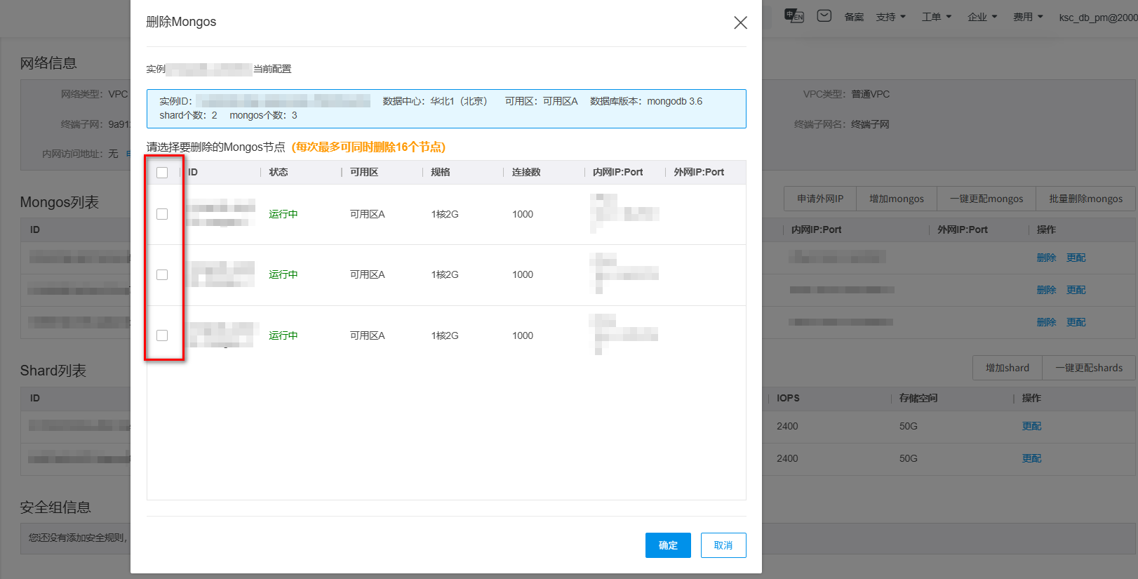 在实例详情页面,点击Mongos列表上的批量删除mongos,弹出批量删除mongos弹框。