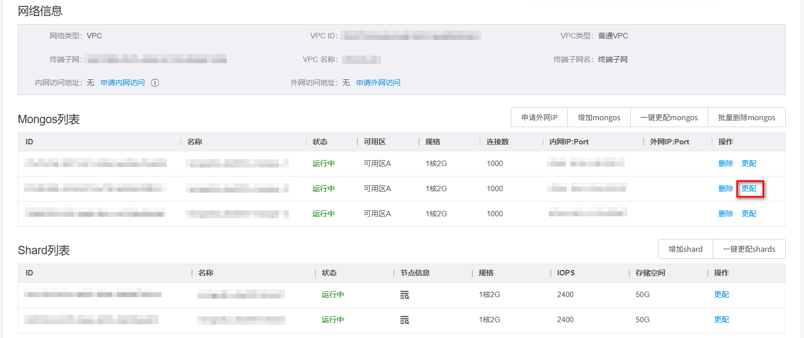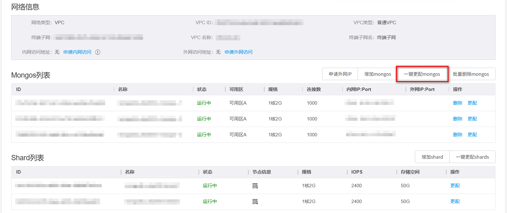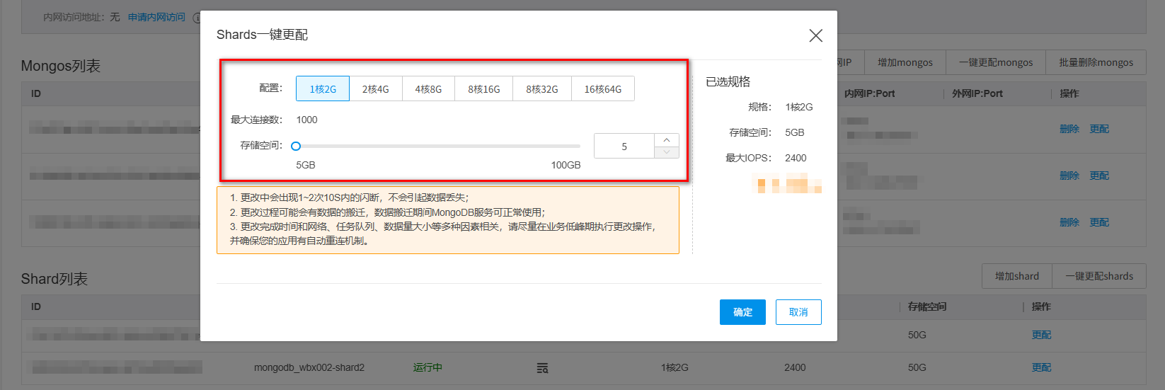 5.批量更改mongos配置、批量更改shards配置会将所有节点的配置统一修改为所选配置,如果存在部分节点配置降低时,请先评估业务风险再进行批量更配操作。