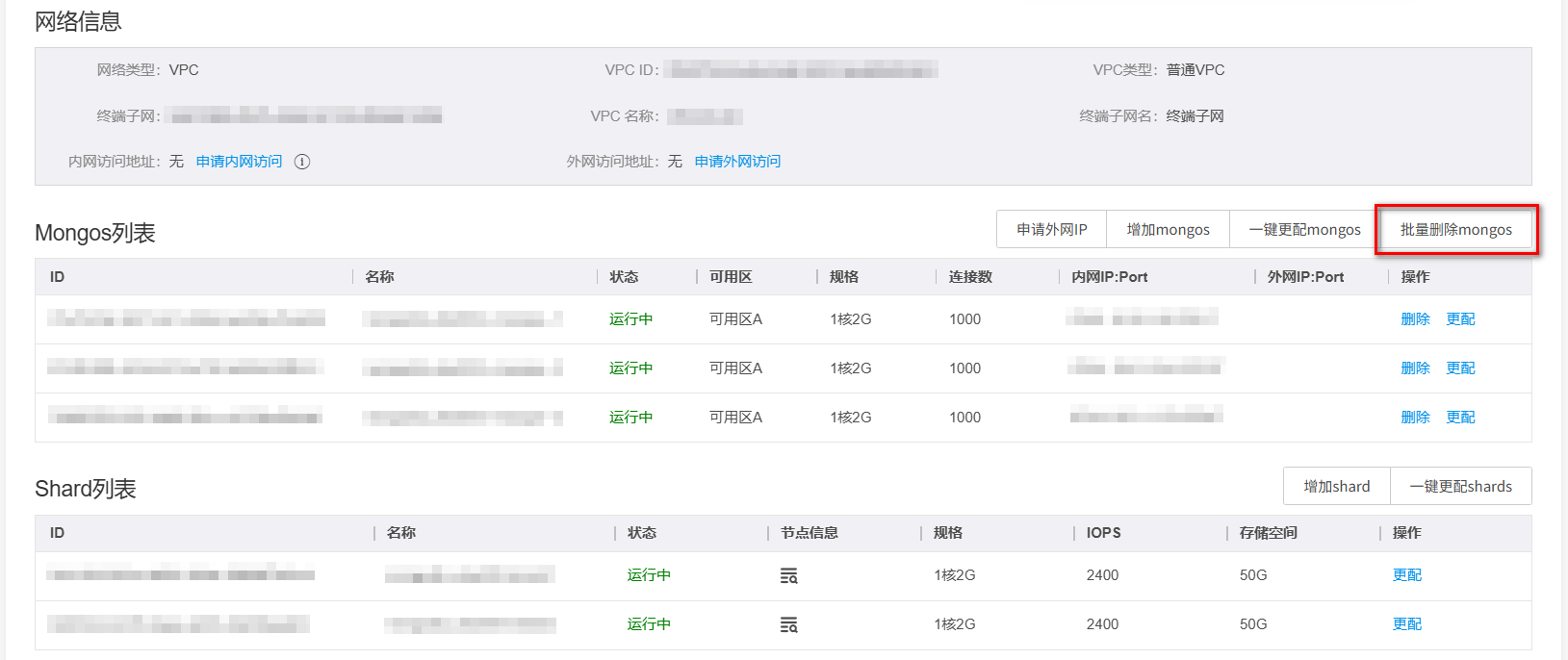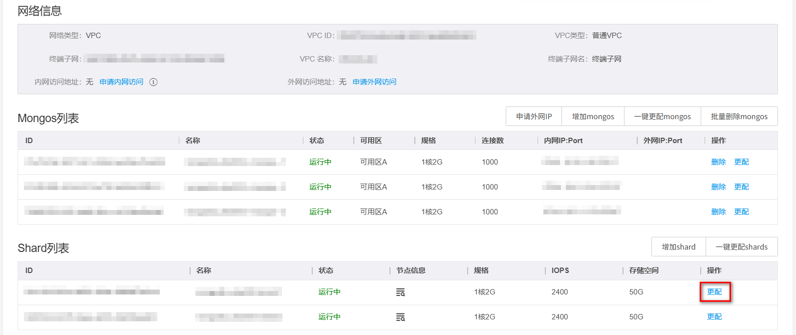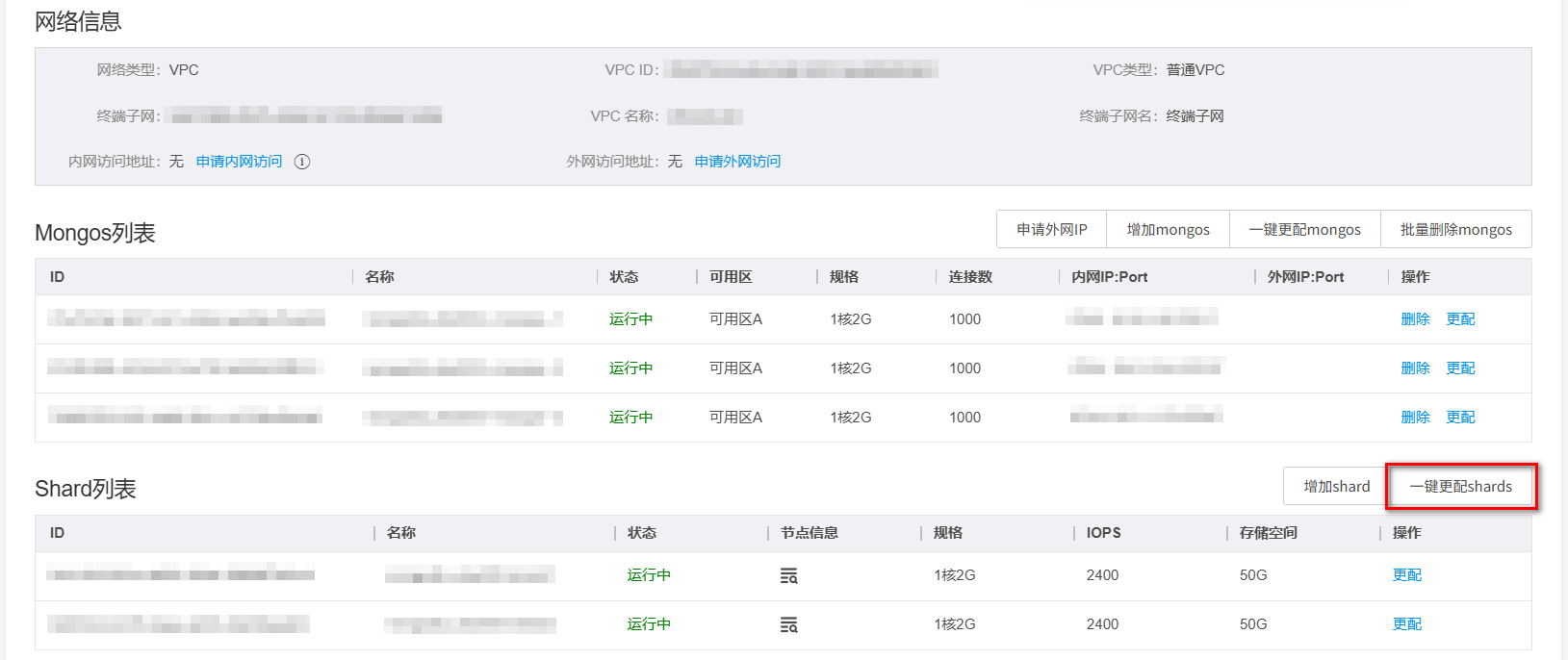 5.批量更改mongos配置、批量更改shards配置会将所有节点的配置统一修改为所选配置,如果存在部分节点配置降低时,请先评估业务风险再进行批量更配操作。