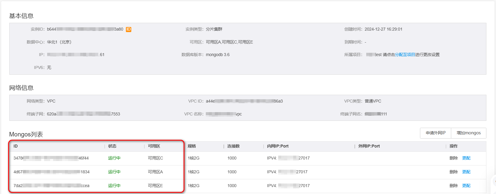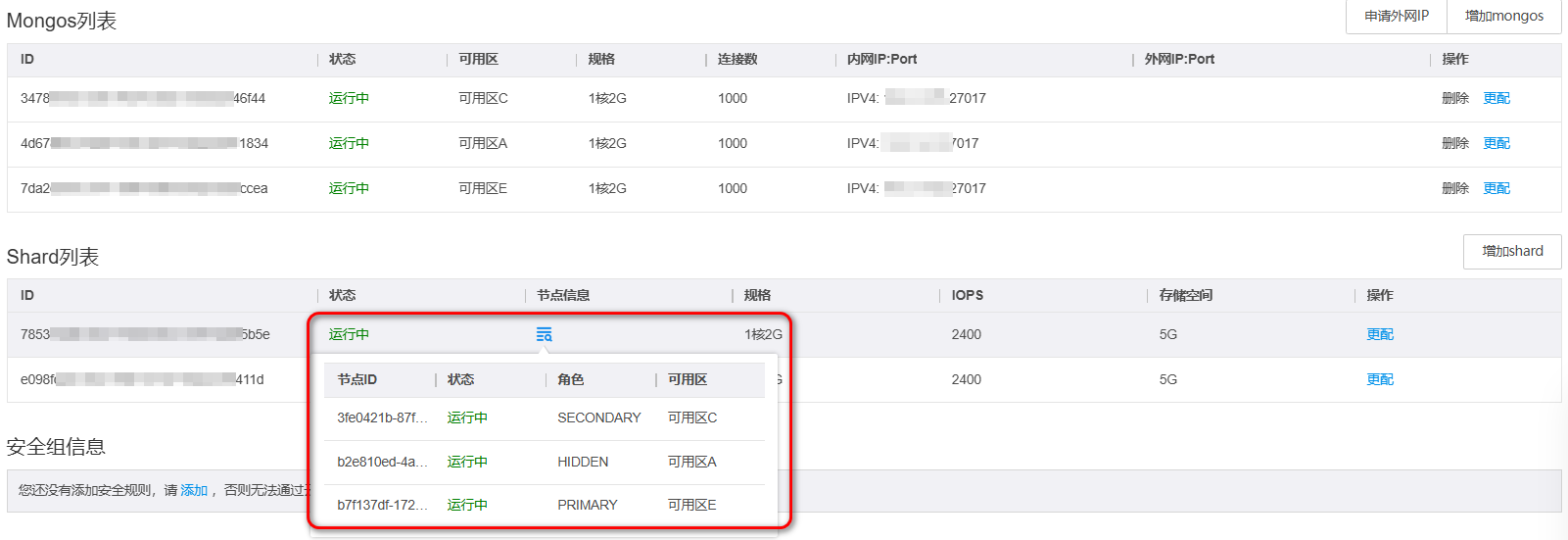 1.进入到分片集群实例详情页面,在Mongos列表中查看各Mongos节点的可用区部署情况。
