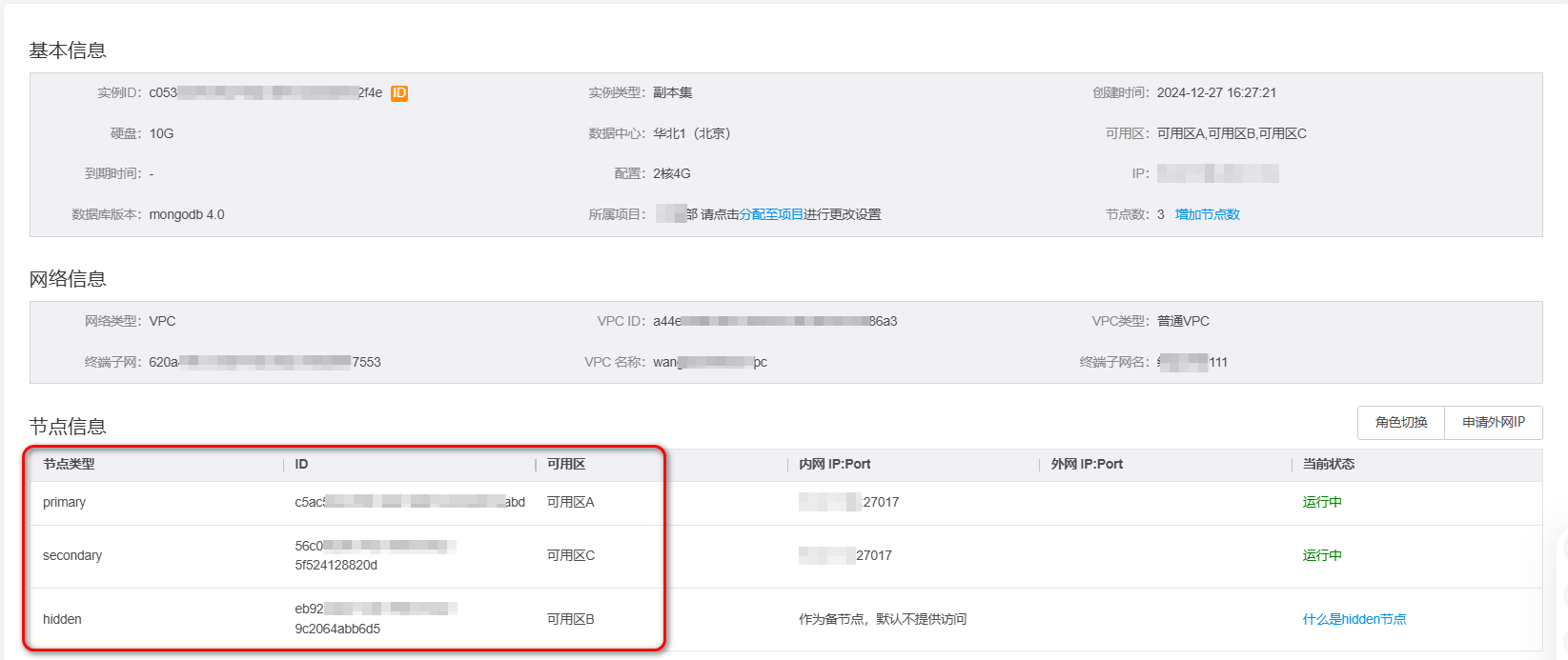 进入到副本集实例详情页面,在节点信息列表中可以查看各节点的可用区部署情况。