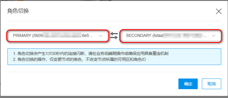 3. 节点角色切换的操作,仅变更节点的角色,不改变节点所属的可用区和角色ID。
