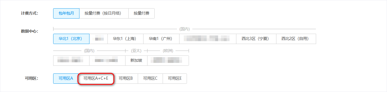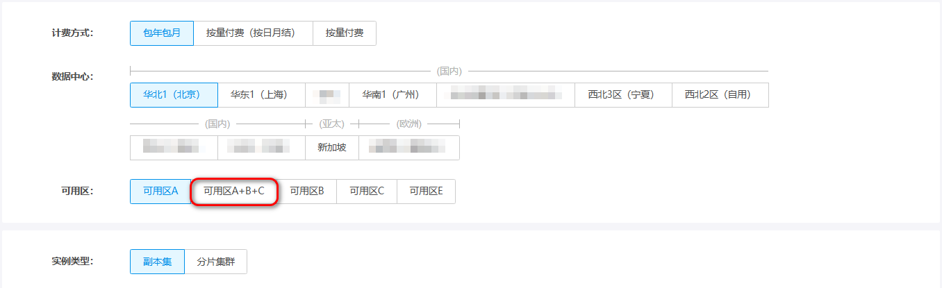 1.目前仅华北1(北京)支持创建多可用区副本集实例,可用区可选A+B+C,华北1(北京)、华东1(上海)支持创建多可用区分片集群实例,华北1(北京)的可选可用区为A+C+E,华东1(上海)的可选可用区为A+B+D。