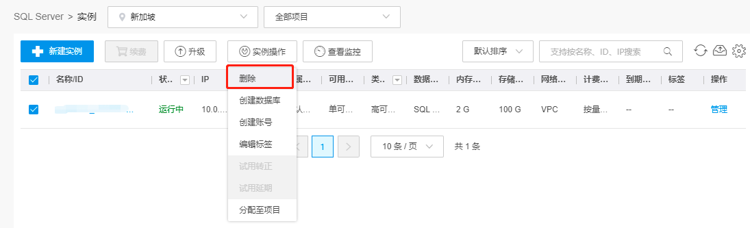 选中实例后,点击实例操作的删除按钮可进行实例的删除。当删除高可用实例时,关联的临时实例将一并删除。