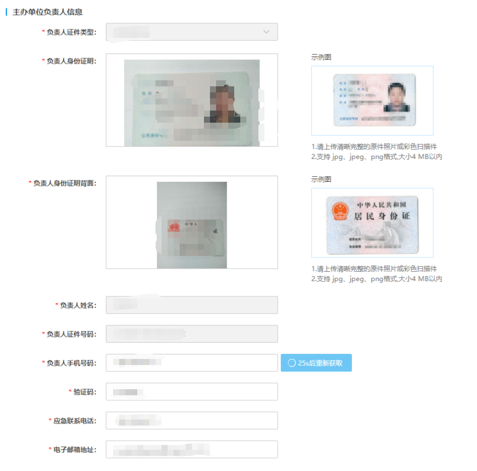 主办单位证件号码 | 填写与主办单位证件上完全一致的证件号码。如果是营业执照或居民身份证,上传证件图后系统会自动识别证件号进行填充 |