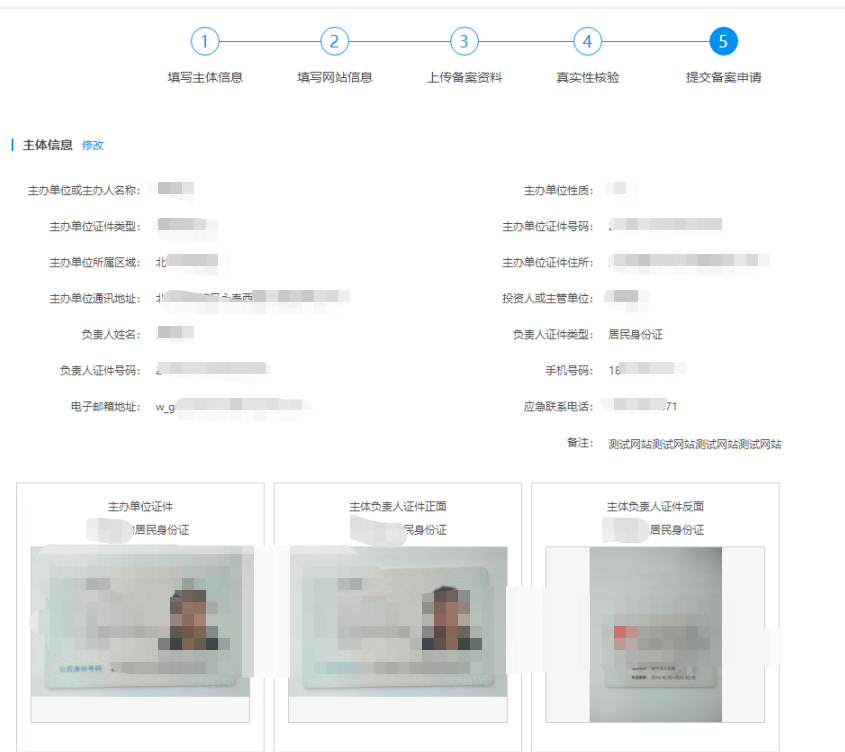 负责人身份证明正面 | 需要拍摄原件上传,如果是居民身份证,支持OCR自动识别姓名和证件号进行填充。 | 系统获取填写备案主体信息环节选择的证件正面,自动填充。 |