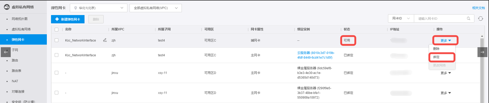 找到想要挂载的弹性网卡(必须是可用状态),单击更多中的绑定。