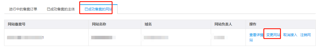2.找到对应的网站信息,单击【变更网站】按钮